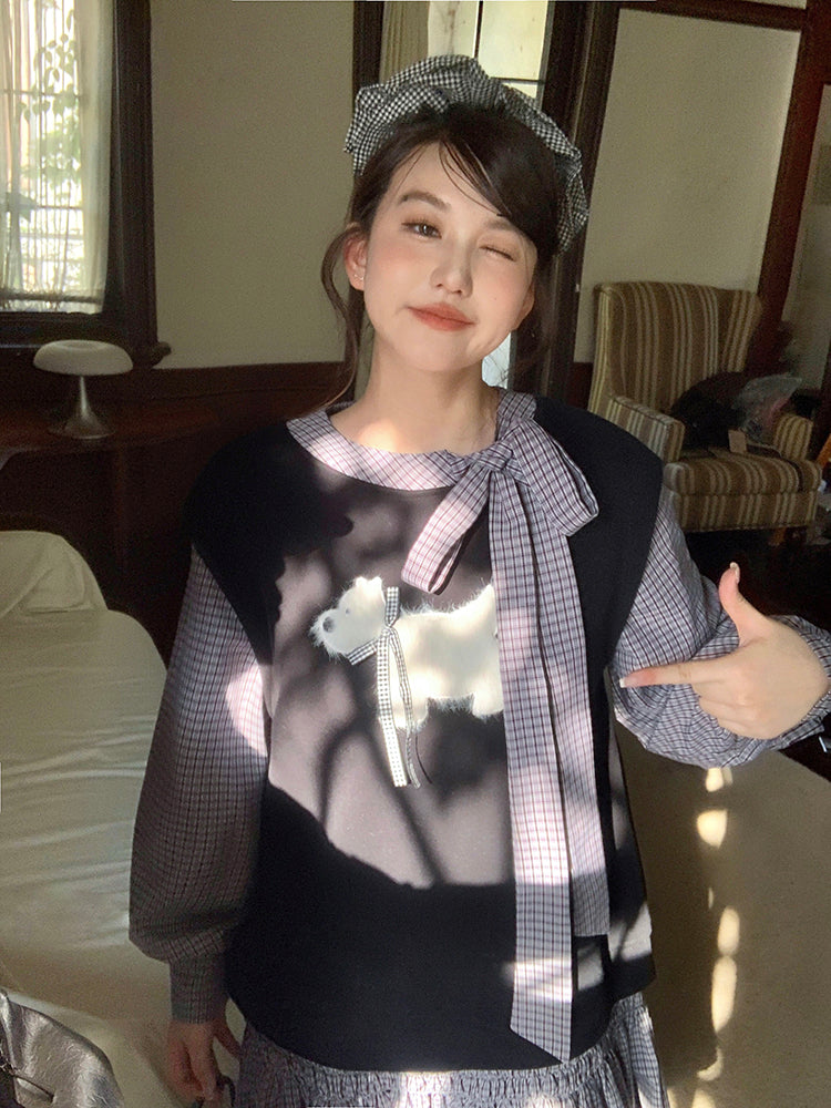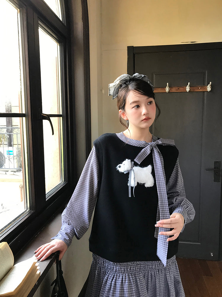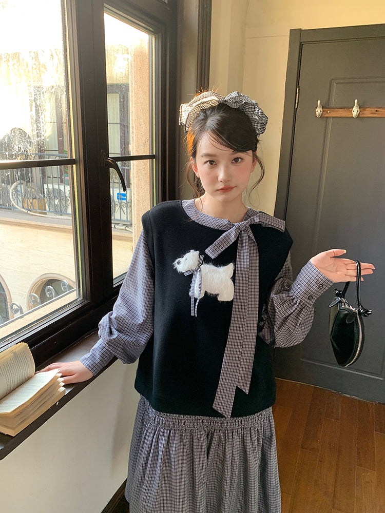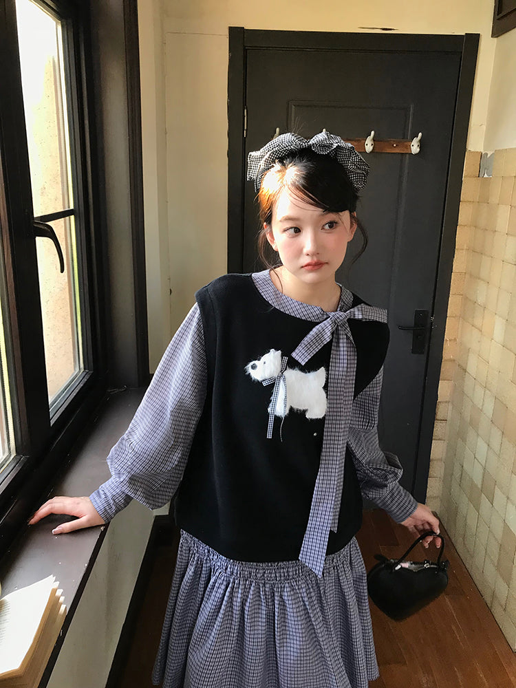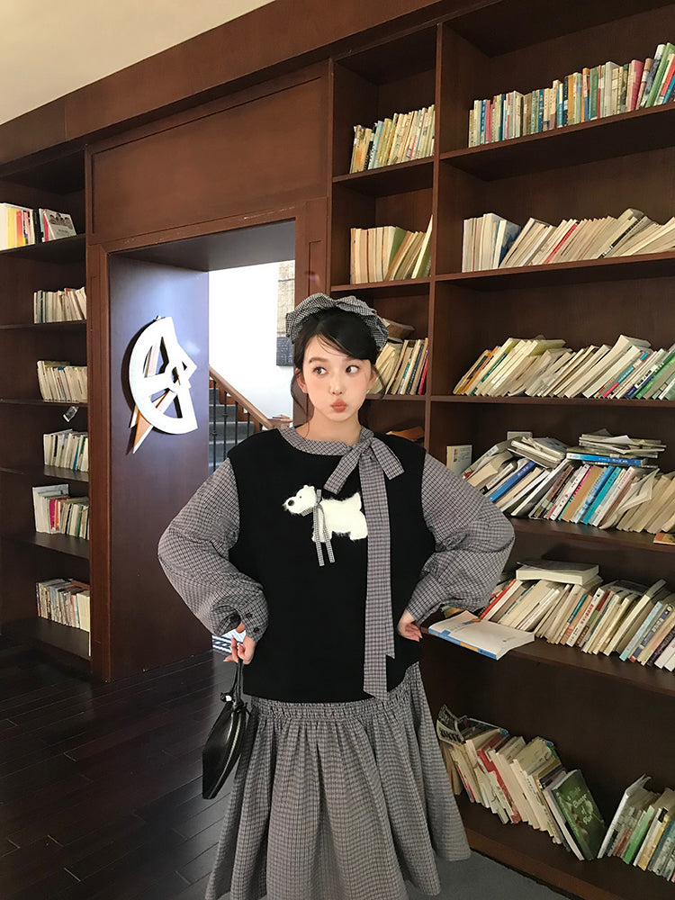 A charming illusion-layered dress blending vintage French whimsy with cozy autumn nostalgia. The soft check plaid flows beneath a contrast black knit bodice, adorned with a ribbon-tied bear motif that feels straight out of a childhood memory.